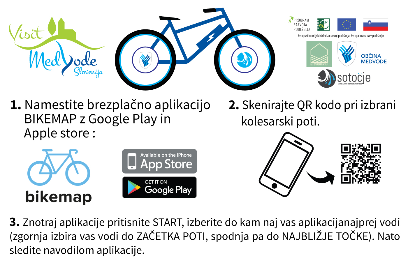 *pri izposoji električnega kolesa gre za paket, ki vključuje izposojo čelade, uporabo mobilne aplikacije BIKEMAP, nosilec za mobilni telefon, svetovanje o pravilni uporabi električnega kolesa in tiskana gradiva medvoških kolesarskih poti in najbolj zanimivih turističnih točk